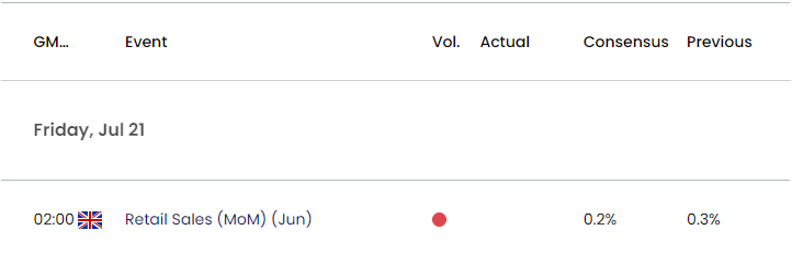 继前一个月增长0.3%之后,预计英国6月零售销售将增长0.2%。6月会议上产生了7比2的投票分歧,需求放缓的迹象可能会导致英国央行内部出现更大的异议。